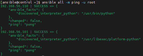 [ansible@control ~]$ ansible all -m ping -u root