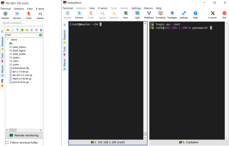 MobaXterm은 아래와 같이 Tab 들이 었어서 세션들 간 편하게 이동하면서 작업할 수 있습니다.