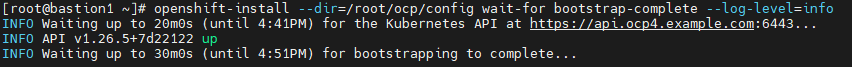 INFO Waiting up to 20m0s (until 4:40PM) for the Kubernetes API at https://api.ocp4.example.com:6443...