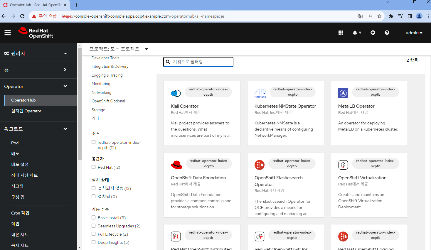웹 콘솔에 접속하여 OperatorHub를 확인합니다. 이전에 적용한 CatalogSource 이름을 확인할 수 있습니다.