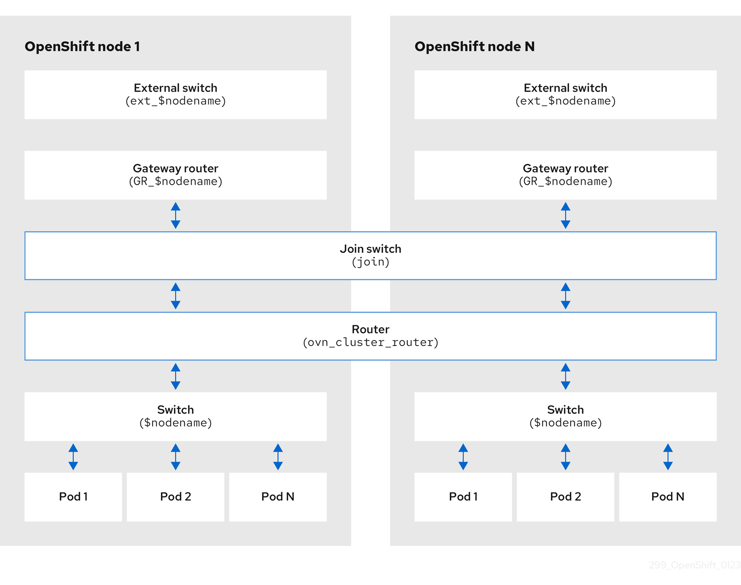 아래의 그림에서 클러스터의 OVN-Kubernetes 논리적 아키텍처를 확인합니다.