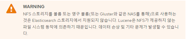 Redhat Openshift Documents 내용을 참고하면 NFS를 이용하여 Volume or Persistent Volume을 생성하여 Elasticsearch storage를 사용하는 것을 데이터 손상 등에 대한 이유로 권장하지 않는다고 기록되어 있습니다.