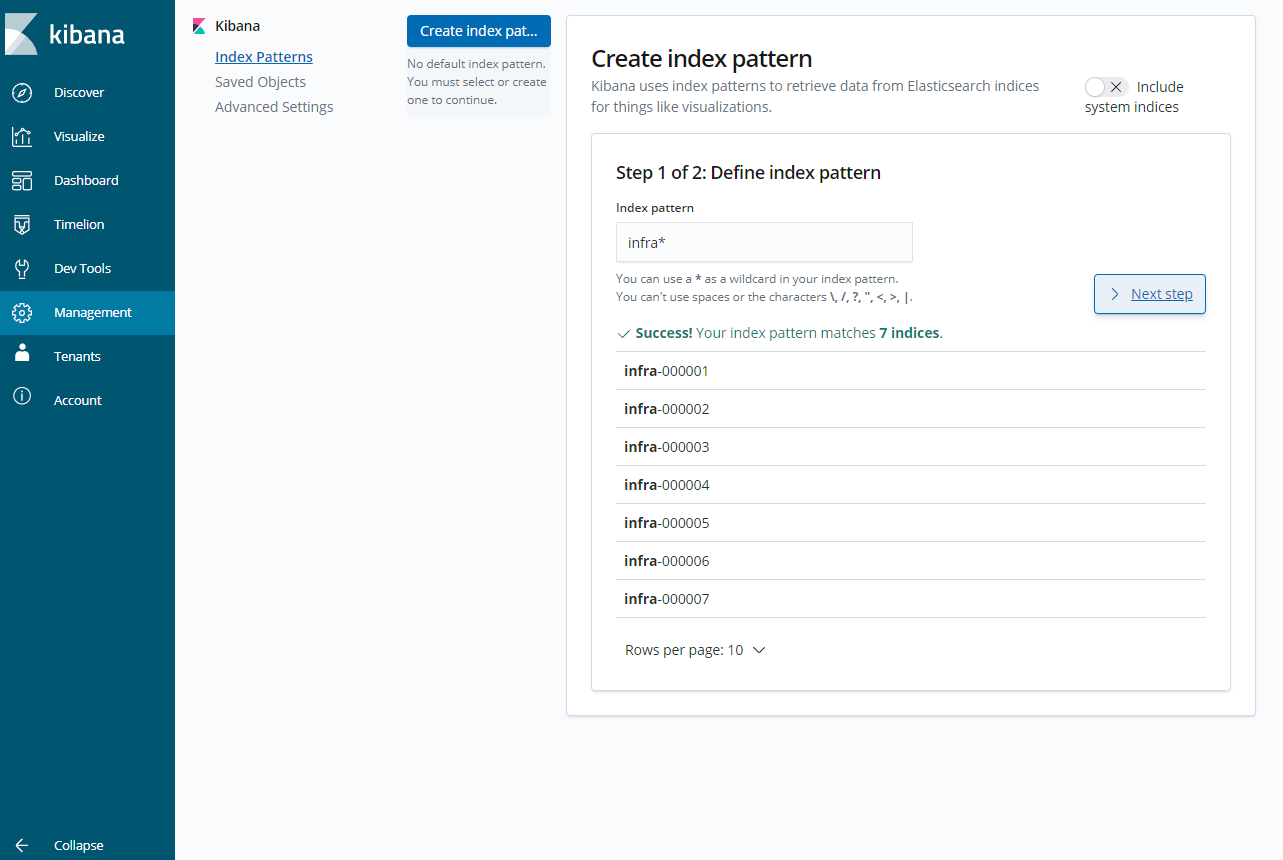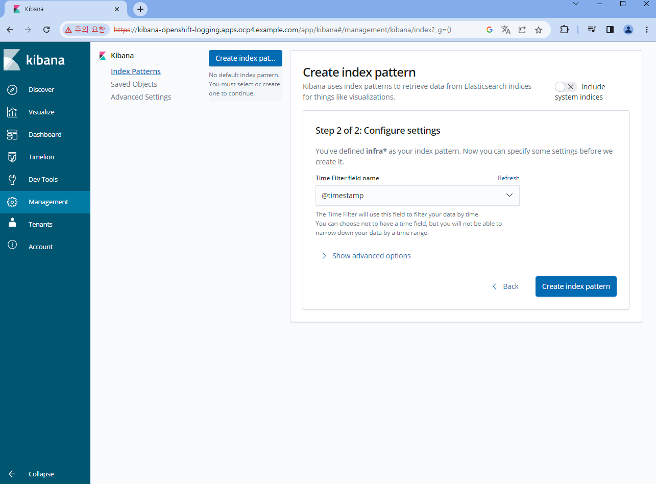 Management → Index Patterns → Create index patterns 를 클릭하여 Kibana 인덱스 패턴을 생성합니다.