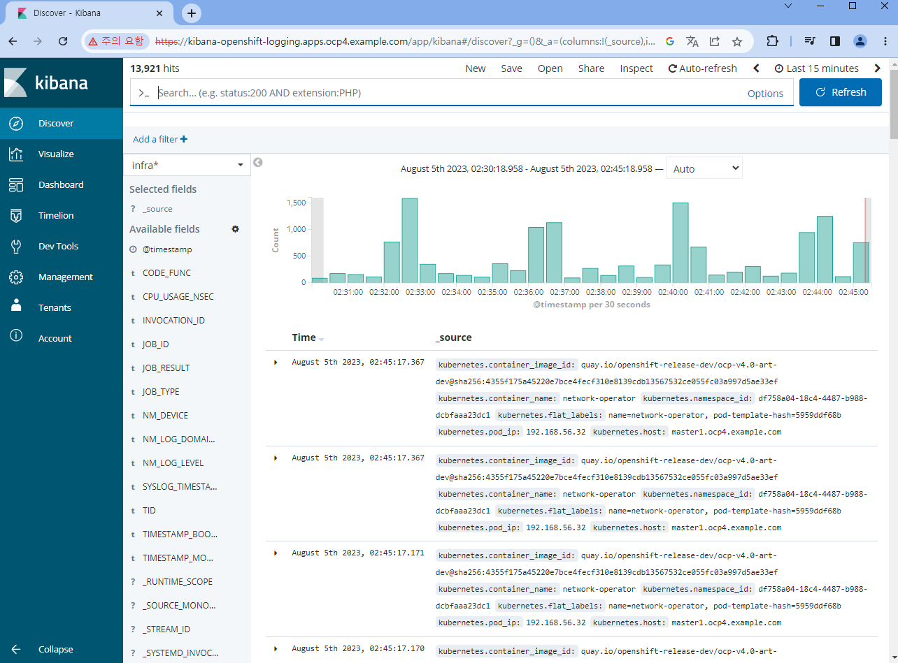 Discover 탭에서 현재 infra와 관련된 log들이 수집되고 시각화된 것을 확인합니다.