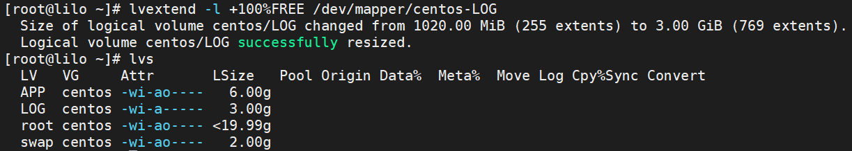 # lvextend -l +100%FREE /dev/mapper/centos-LOG