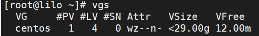 그리고 나서 우리가 추가할 볼륨 그룹의 상태를 확인해줍니다. "centos"라는 볼륨 그룹이네요.