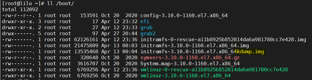 기본적으로 "/boot" 디렉토리에 initamfs-*.kdump.img가 준비되어 있습니다. 커널 패닉이나 OS 행시 해당 부팅 이미지를 통해 로딩이 됩니다.