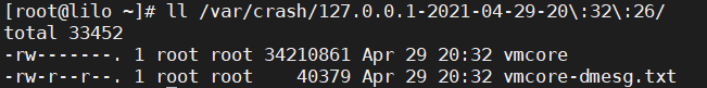 # vi /var/crash/127.0.0.1-2021-04-29-20:32:26/vmcore-dmesg.txt