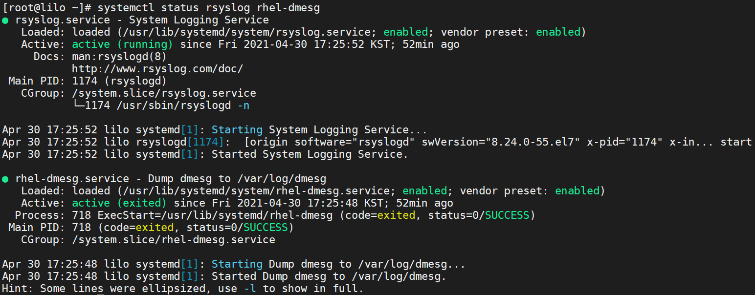 우리가 설치하지 않아도 기본적으로 리눅스를 설치하면 Active 상태로 돌아가고 있는 데몬들이 있습니다. 그 중에서 rsyslog와 rhel-dmesg가 로그에 관한 역할들을 하는 친구들입니다.