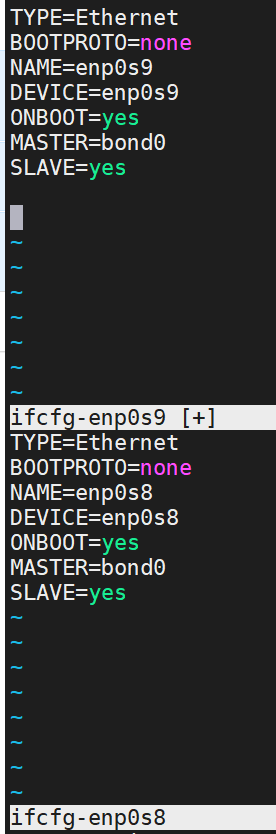위와 같이 설정 후 저장합니다. 이 설정은 "enp0s8"과 "enp0s9" 네트워크 인터페이스를 "bond0"라는 본딩의 SLAVE로 사용한다는 설정입니다.