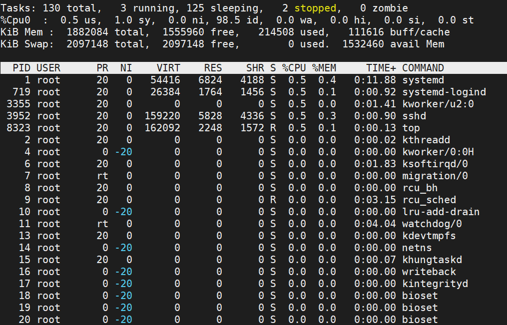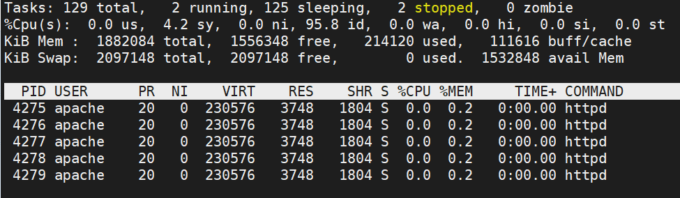 Shared, Buffer, Cache를 포함한 여유 공간인 Free 영역이 1.53G 정도 남았고 전체적으로 봤을 때도 거의 사용하지 않은 편입니다. Swap 영역도 전혀 건드리지 않았습니다.