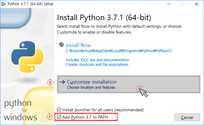 설치 및 환경 세팅에 미숙한 분들은 설치시 아래의 사진과 같이 환경변수를 추가하는 칸에 체크를 해줍니다.