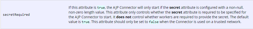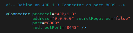 <Connector protocol="AJP/1.3" address="0.0.0.0" secretRequired="false" port="8009" redirectPort="8443" />