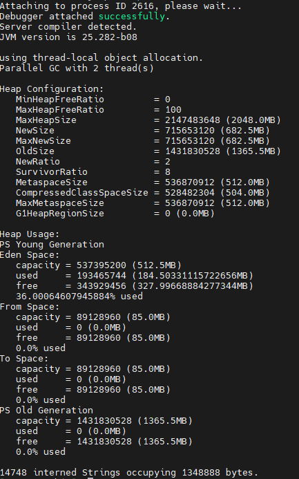 PID는 2616이고 Heap Memory는 2048M로 확인되고 Metaspace 크기는 512M으로 확인됩니다.