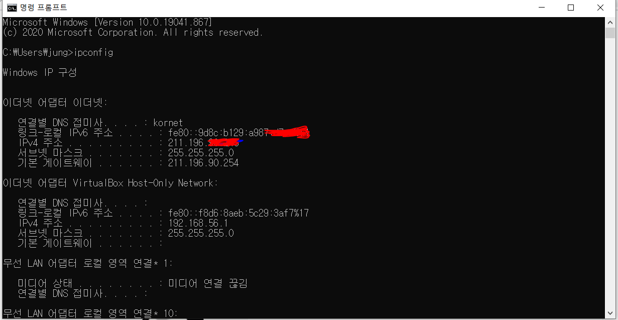 위와 같이 "명령 프롬프트(cmd)" 터미널을 띄우고 "ipconfig"라는 명령을 입력해줍니다.
